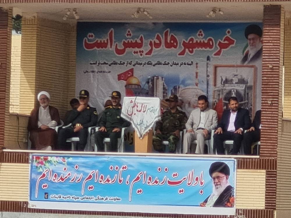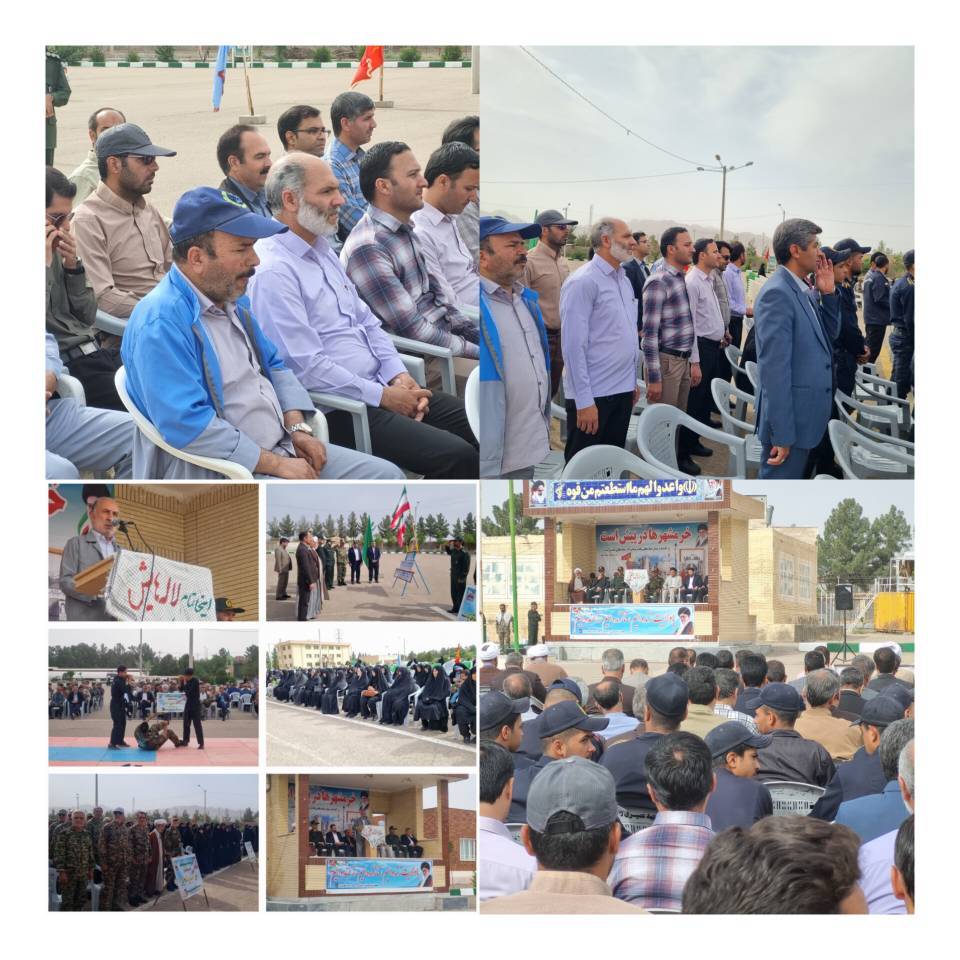 حضور تعدادی از بسیجیان پایگاه شهید چمران شرکت مدیریت تولید نیروگاه های گازی خراسان، در مراسم صبحگاه مشترک نیروهای نظامی و انتظامی و بسیجیان پایگاه های شهرستان به مناسبت سوم خرداد ماه سالروز فتح خرمشهر در عملیات غرور آفرین بیت المقدس.