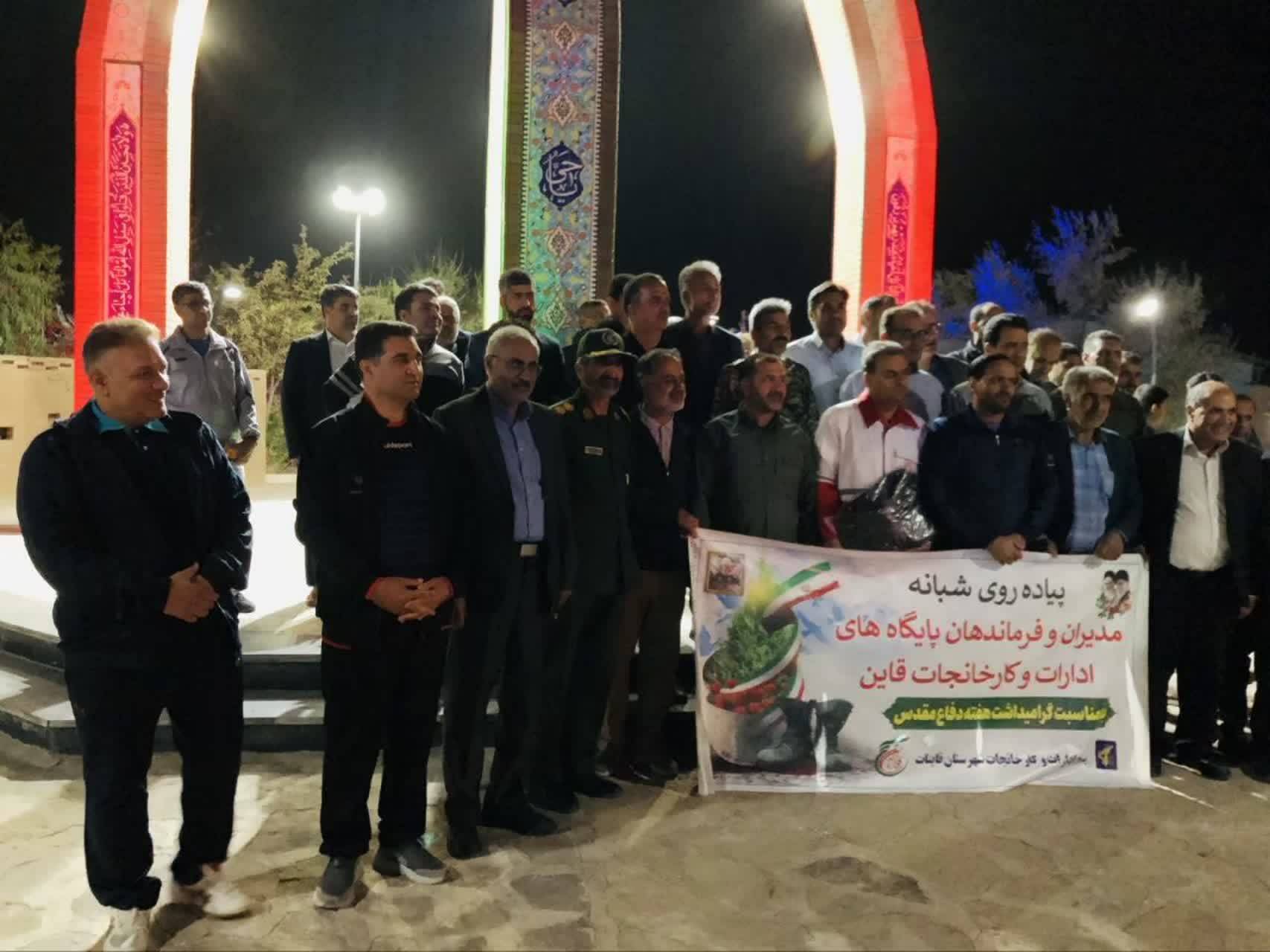 حضور جمعی از بسیجیان پایگاه شهید چمران، در پیادهروی شبانه مدیران و فرماندهان پایگاههای مقاومت بسیج شهر قاین به مناسبت هفته دفاع مقدس.
